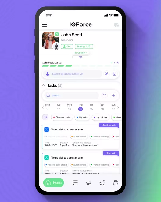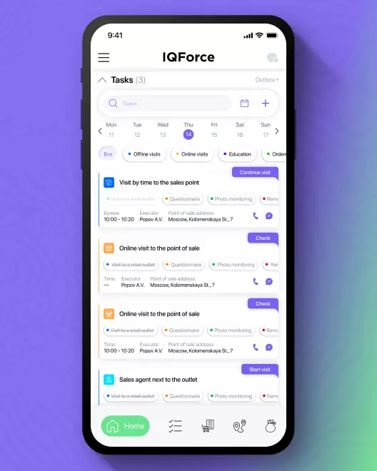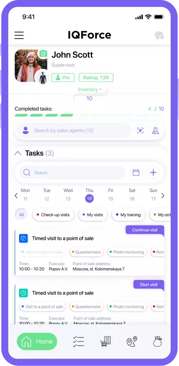 Thanks to the work in a single ecosystem of IQ Force + IQ Retail, outlets see the actions of a sales agent planned for the next visit: ordering, questioning, withdrawal of balances, training, merchandising, etc., and can independently complete these tasks for an additional reward.