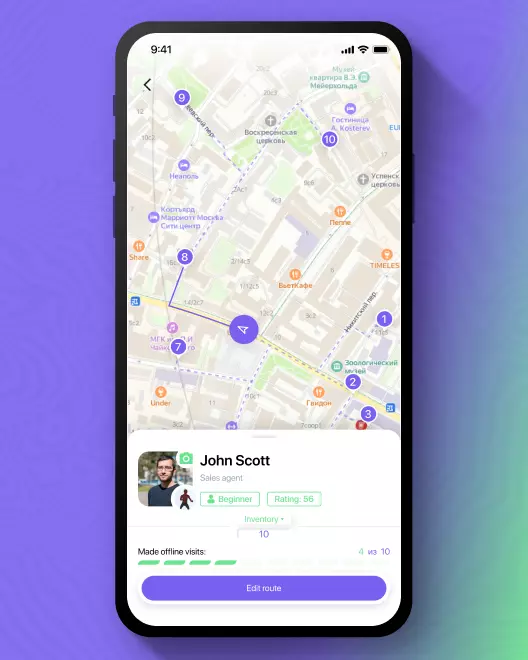 Dynamic routes of sales agents are displayed on an interactive map both for the employee himself and for his supervisor, who has the ability to manually make changes to the route and control the location of employees and their movements online.