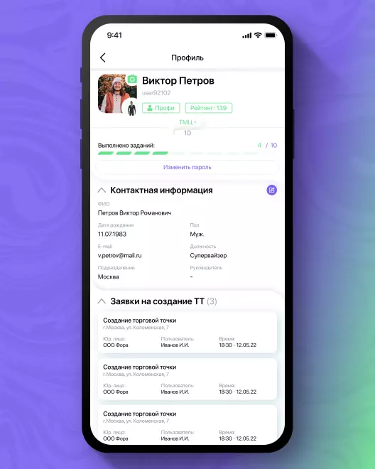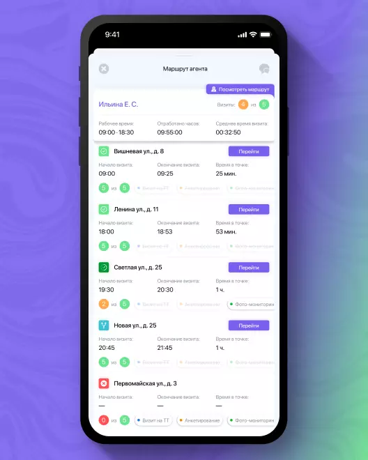 Умная система аналитики составляет подробные отчёты по каждому из сотрудников: сколько визитов из запланированных было выполнено, сколько времени было затрачено на перемещения из одной точки в другую, все ли необходимые действия на точке зафиксированы в чек-листах, в каких моментах происходят нарушения стандартов компании.