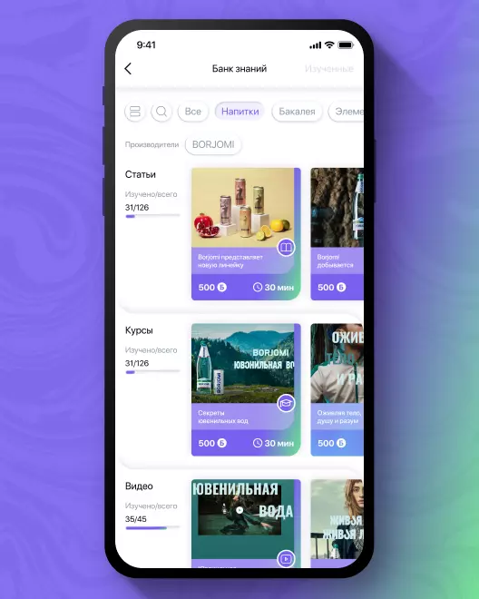 В режиме онлайн даём возможность проводить обучение торговых агентов в соответствии с необходимыми навыками: внедрение новинок, мерчендайзинг, работа с возражениями и т. д. Привязываем к обучению отработку практических навыков (гибкая настройка нужных KPI) и строим рейтинг сотрудников на основе пройденных курсов и выполненных KPI.