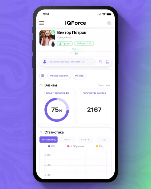 IQ Force предоставляет возможность выставления планов продаж на торговых агентов с учётом всех нюансов их работы: географический фактор, количество торговых точек в работе, SKU в портфеле, наличие маркетинговых активностей и т. д.