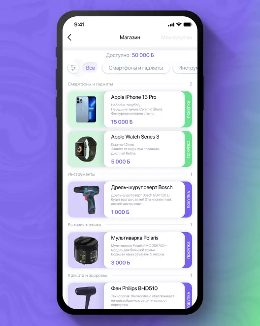 Полученные за обучение баллы можно вывести на карту в виде бонусных выплат или обменять на призы и подарки (как физические, так и виртуальные — медали, сертификаты, персонализированные аватары), повышая вовлечённость и мотивацию сотрудников.