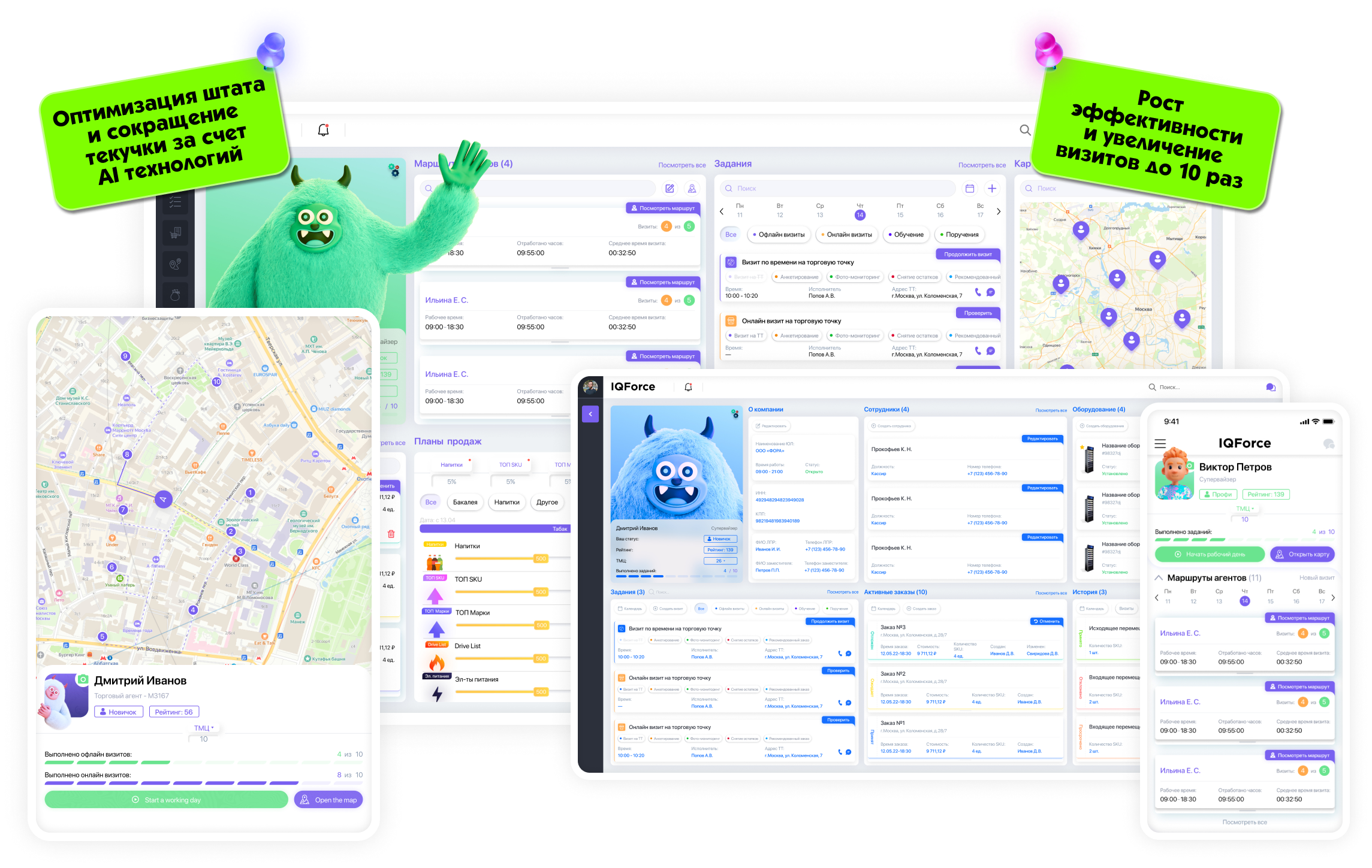 IQ Force — инновационное решение для оптимизации работы торговых агентов, супервайзеров, мерчендайзеров и любых выездных сотрудников, объединяющее модульную CRM-систему, настраивающуюся под конкретные бизнес-процессы, и умные инструменты работы с маршрутами на основе Big Data и нейронных сетей AI.
