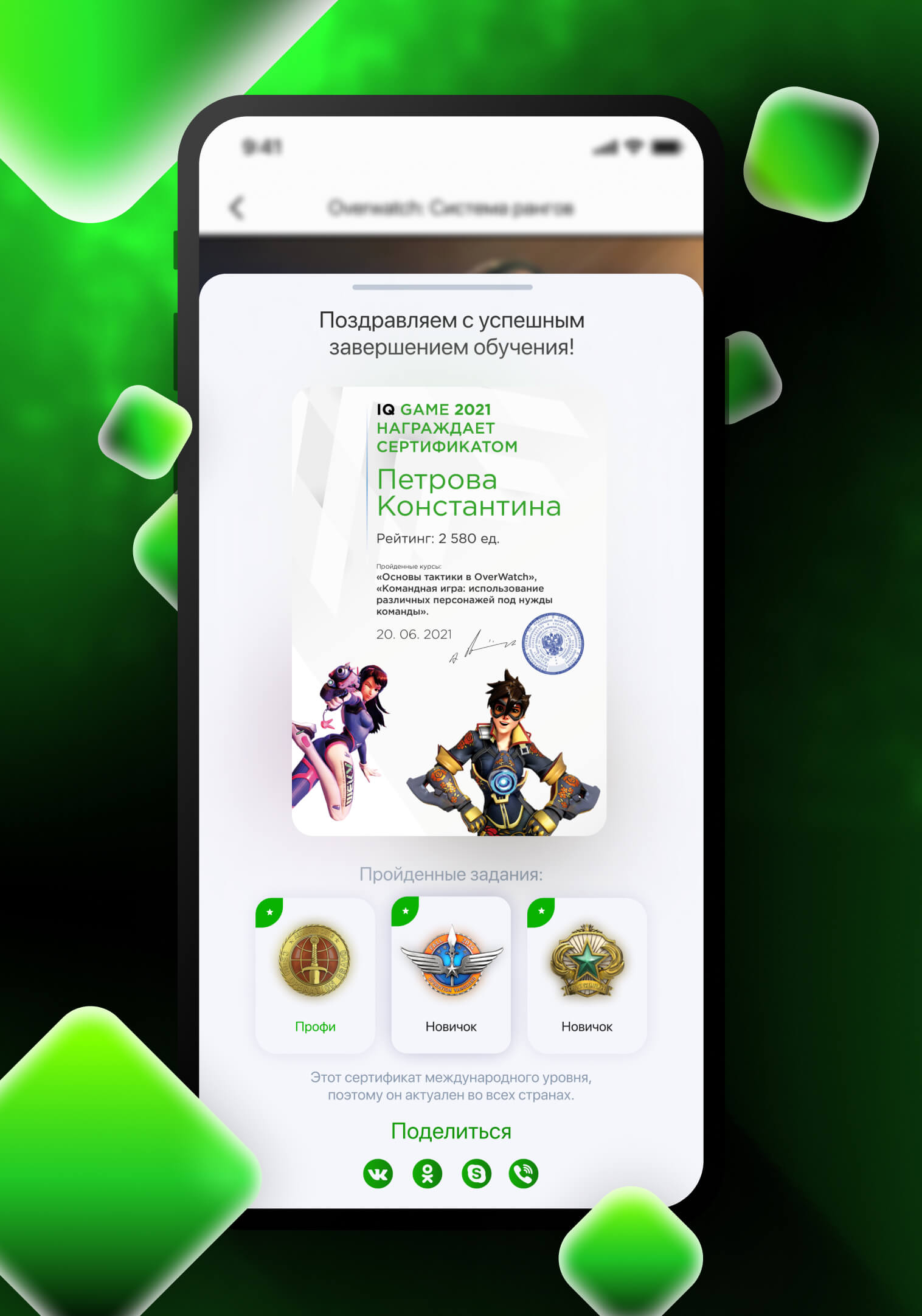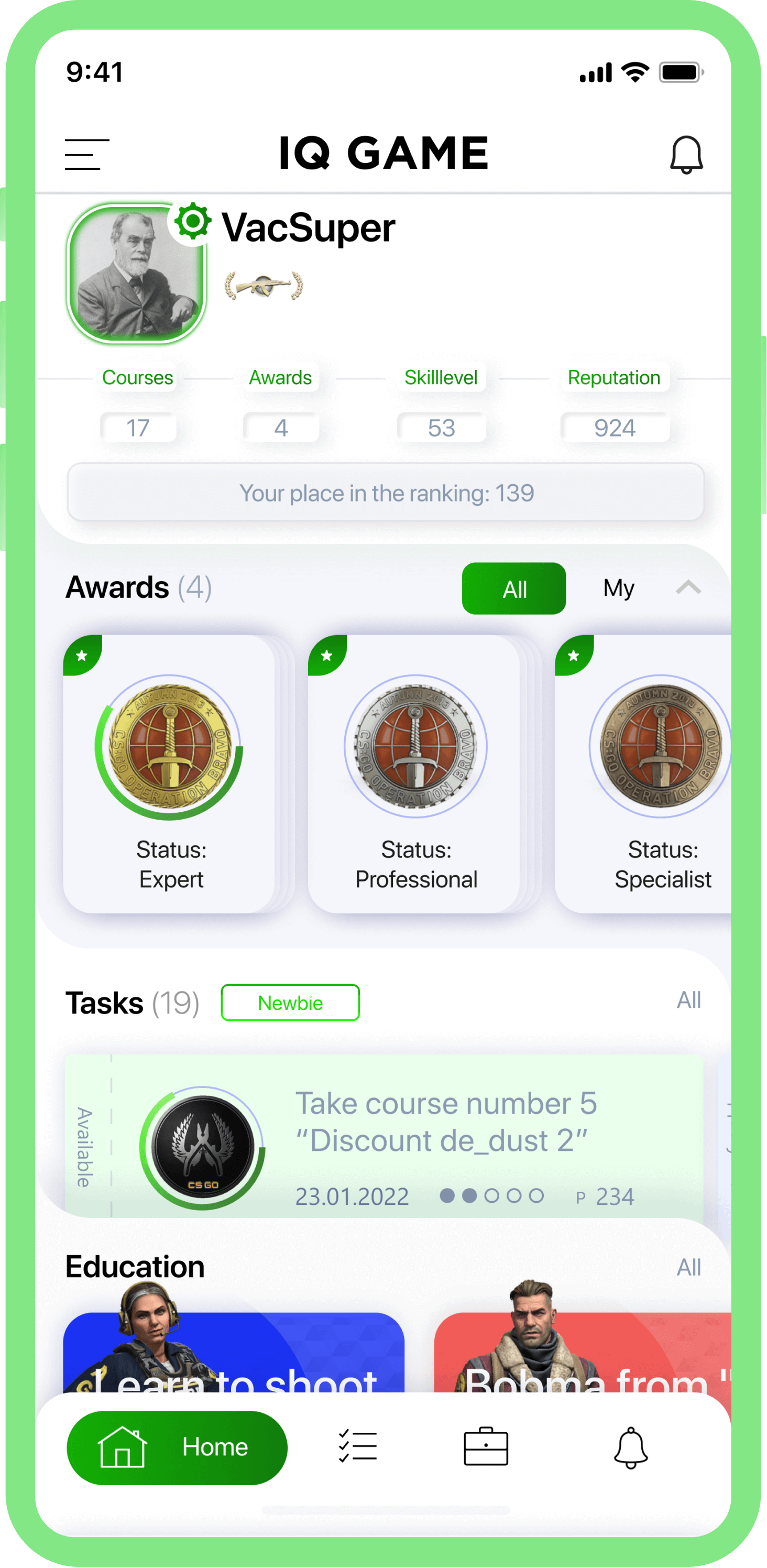 По итогам обучения пользователь сдаёт выпускные экзамены и получает диплом о прохождении курса. Из набранных во время обучения и экзаменов баллов формируется рейтинг лучших игроков IQ GAME, получающих возможность заливать на платформу свой обучающий контент, получая вознаграждение, а также претендовать на участие в масштабных турнирах, попадая в профессиональные кибер-команды.