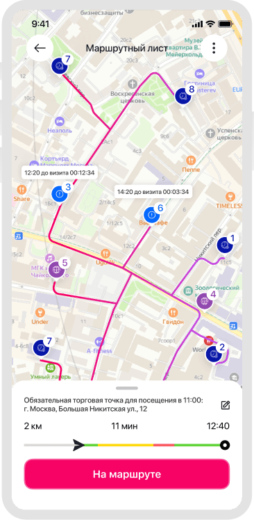 Drawing up optimal route sheets for field employees, taking into account their customer base and territory in work. Assigning repeating routes to an employee and transferring movement data to the manager, both online and in post-report format.