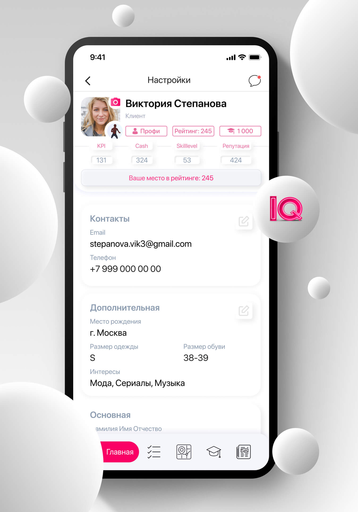 • Basic information: last name, first name, patronymic, date of birth, gender, postal address, company
