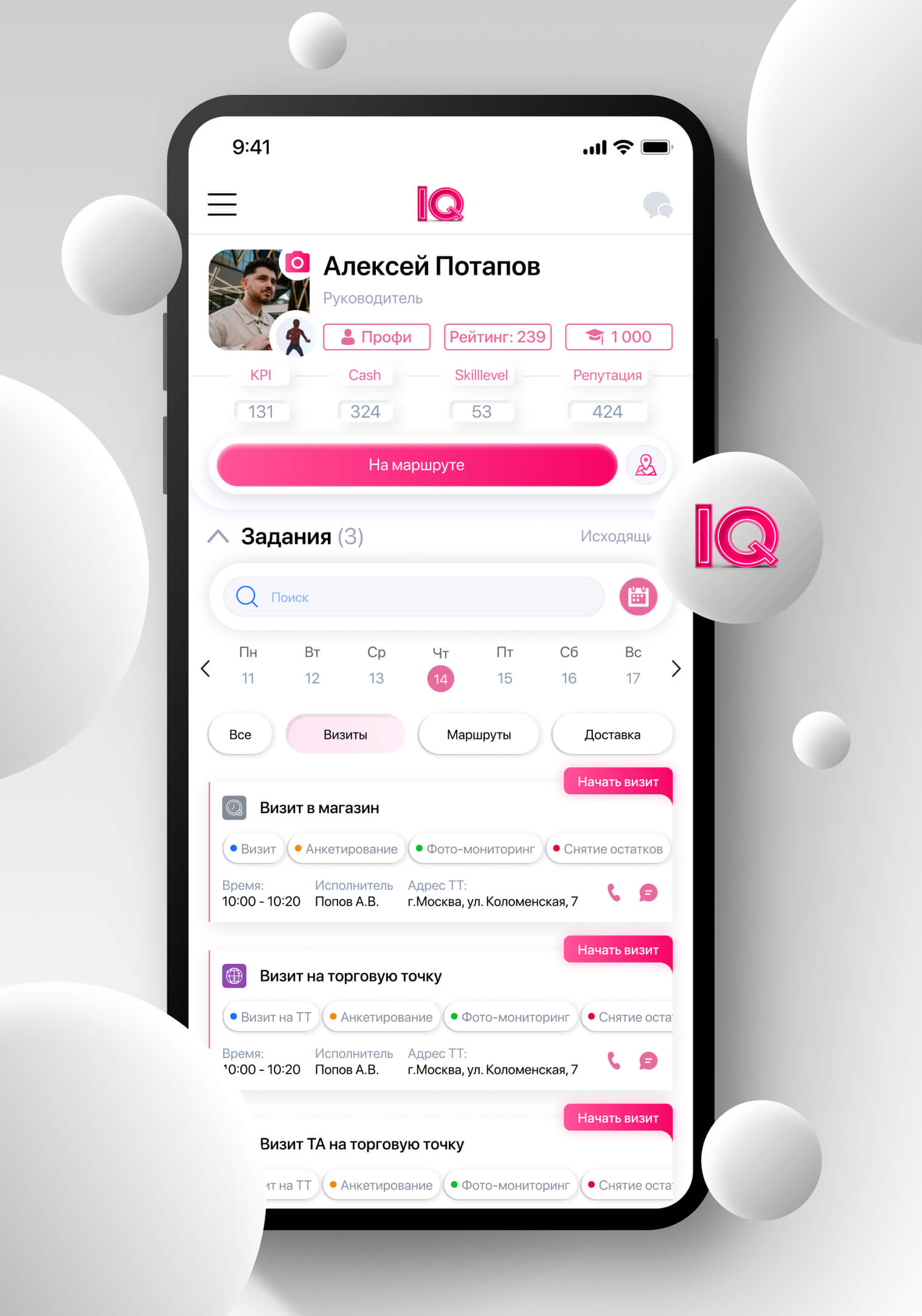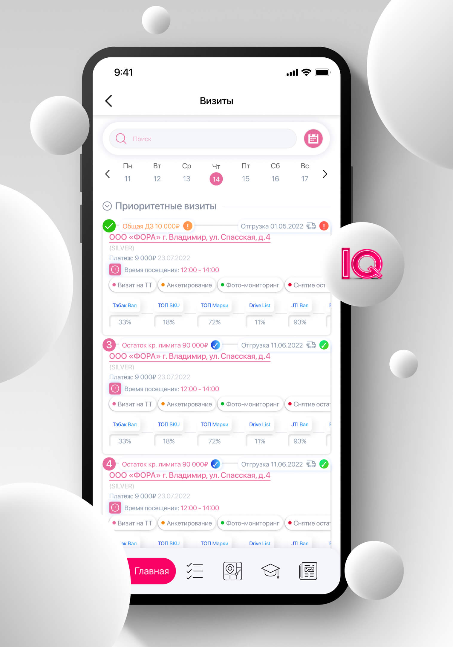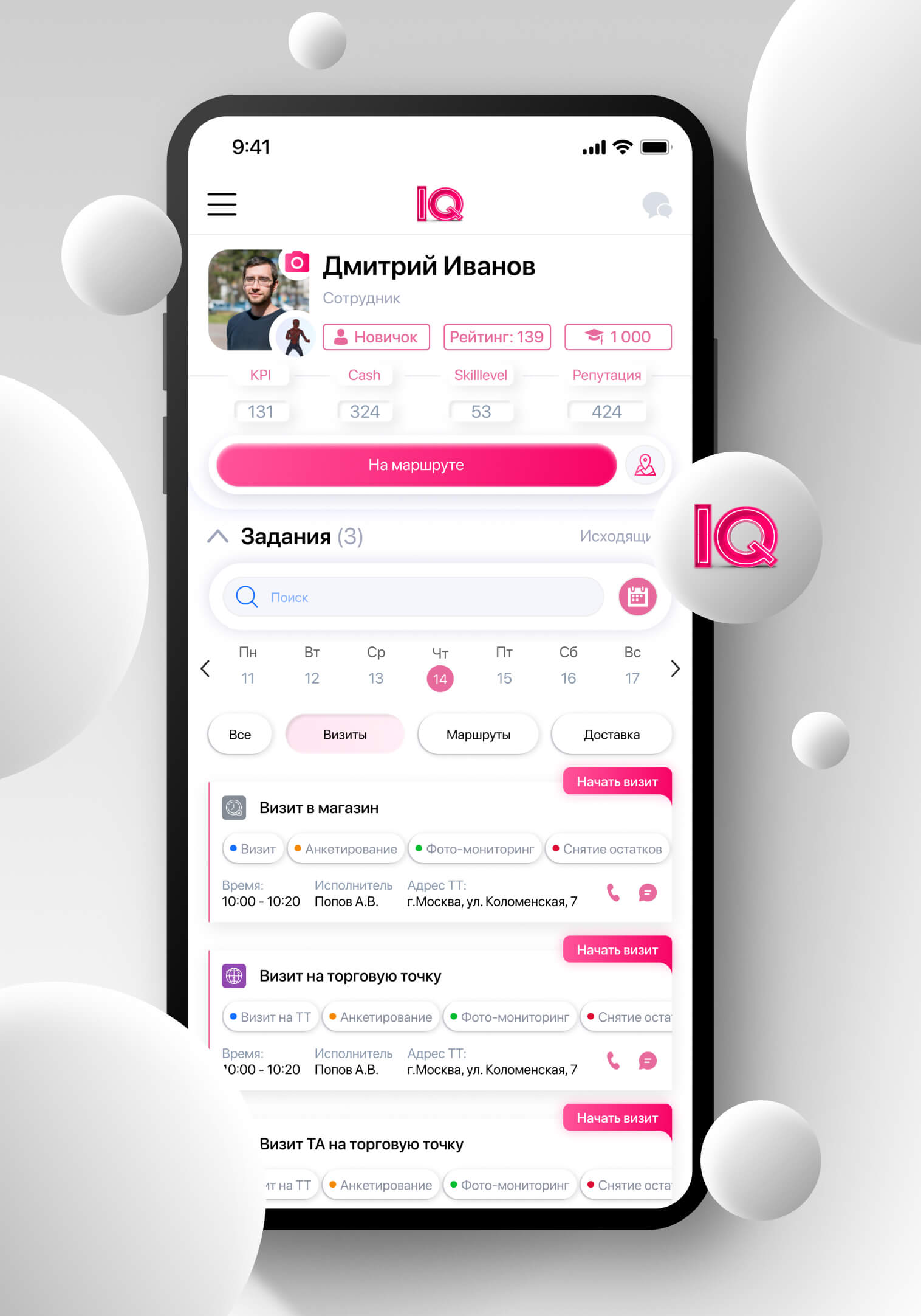 The module allows you to control and bring to uniform standards the work of employees who move during the day. IQ Geo Tracking will record the employee’s arrival at the required location, automatically calculate the duration of each visit, offer to fill out checklists for the required set of actions at the facility, and also display the employee’s movements during the day on the map.