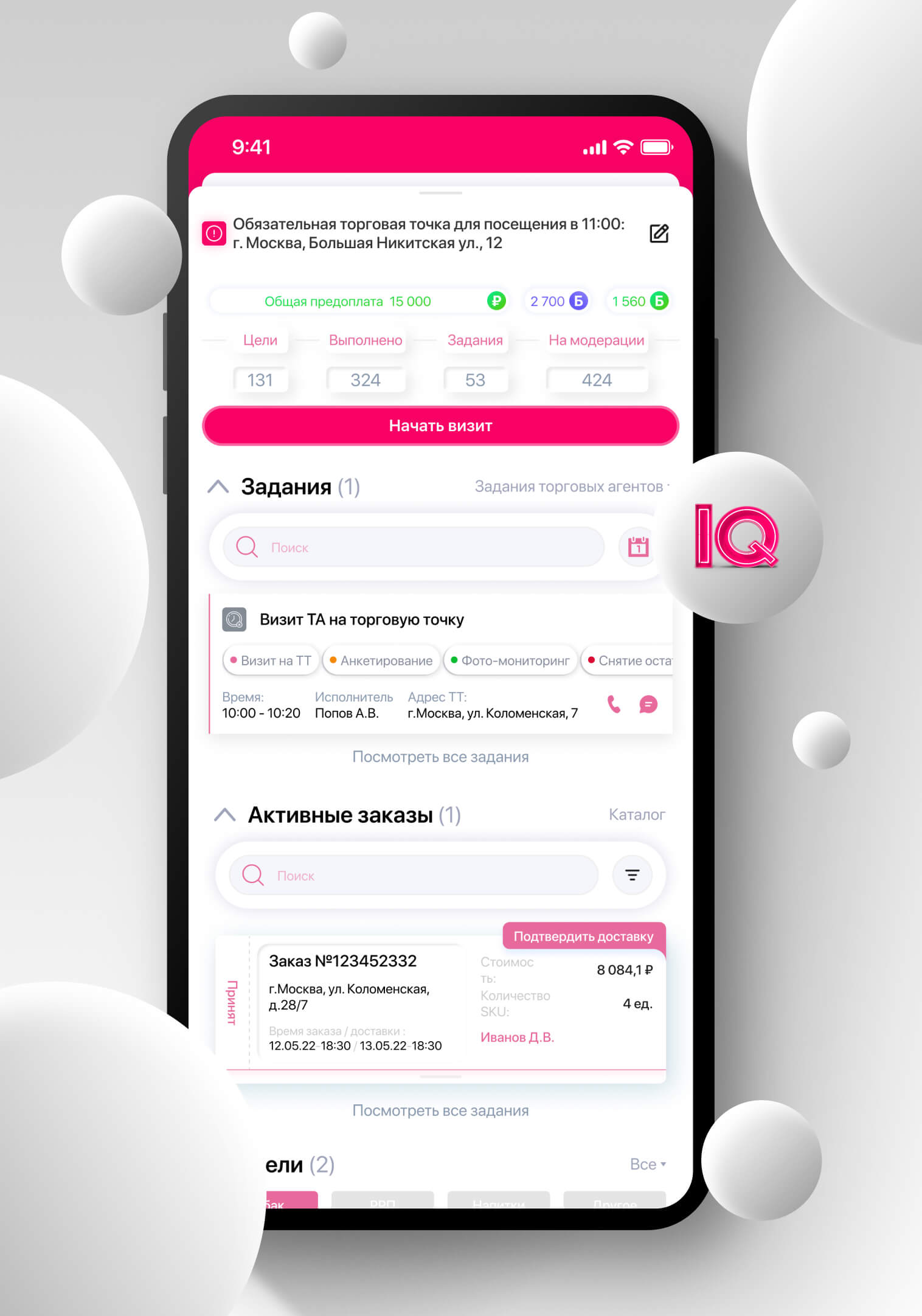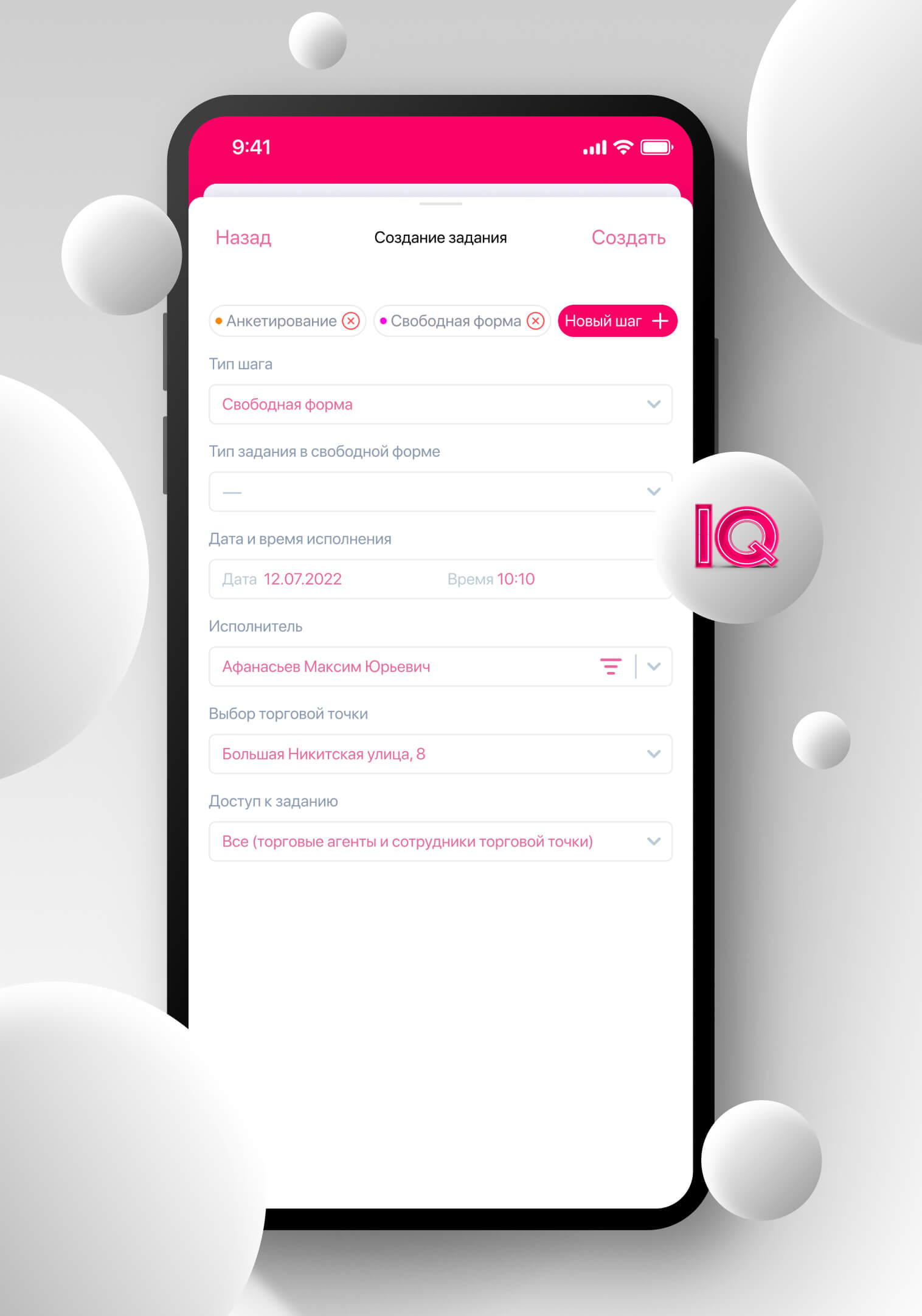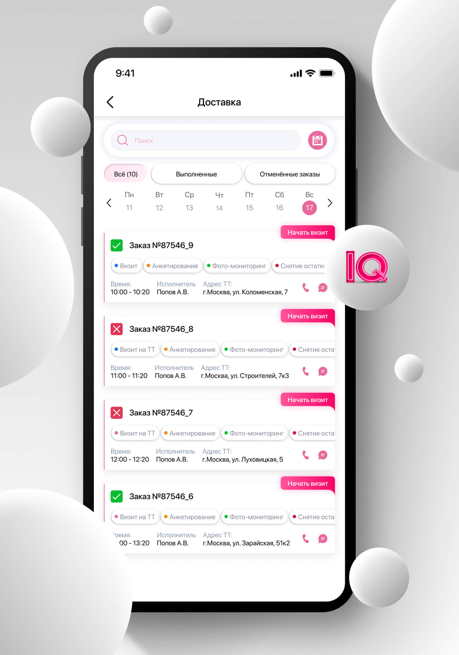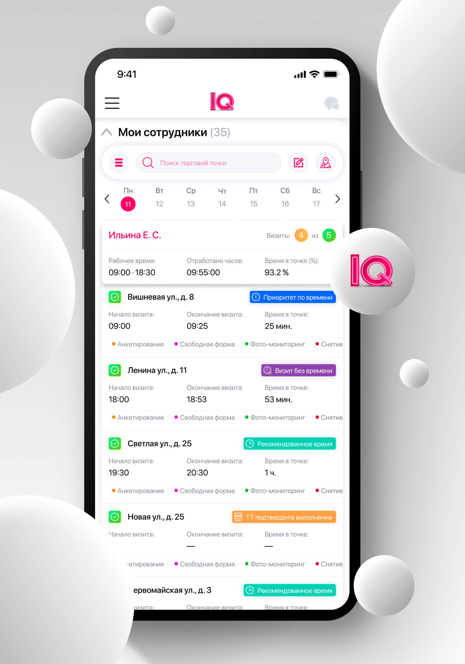 The module allows you to control and bring to uniform standards the work of employees who move during the day. IQ Geo Tracking will record the employee’s arrival at the required location, automatically calculate the duration of each visit, offer to fill out checklists for the required set of actions at the facility, and also display the employee’s movements during the day on the map.