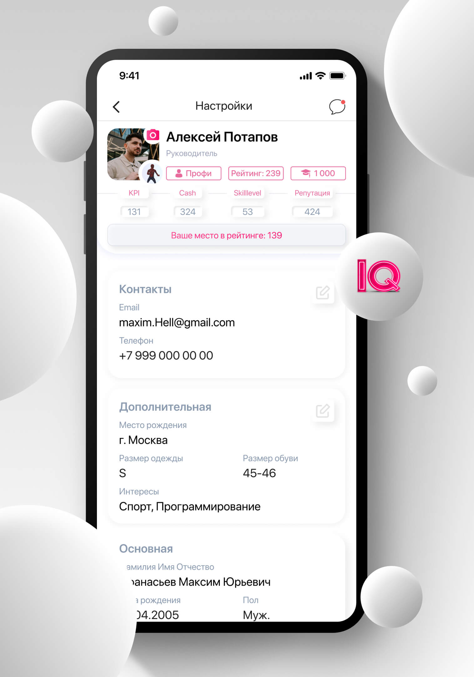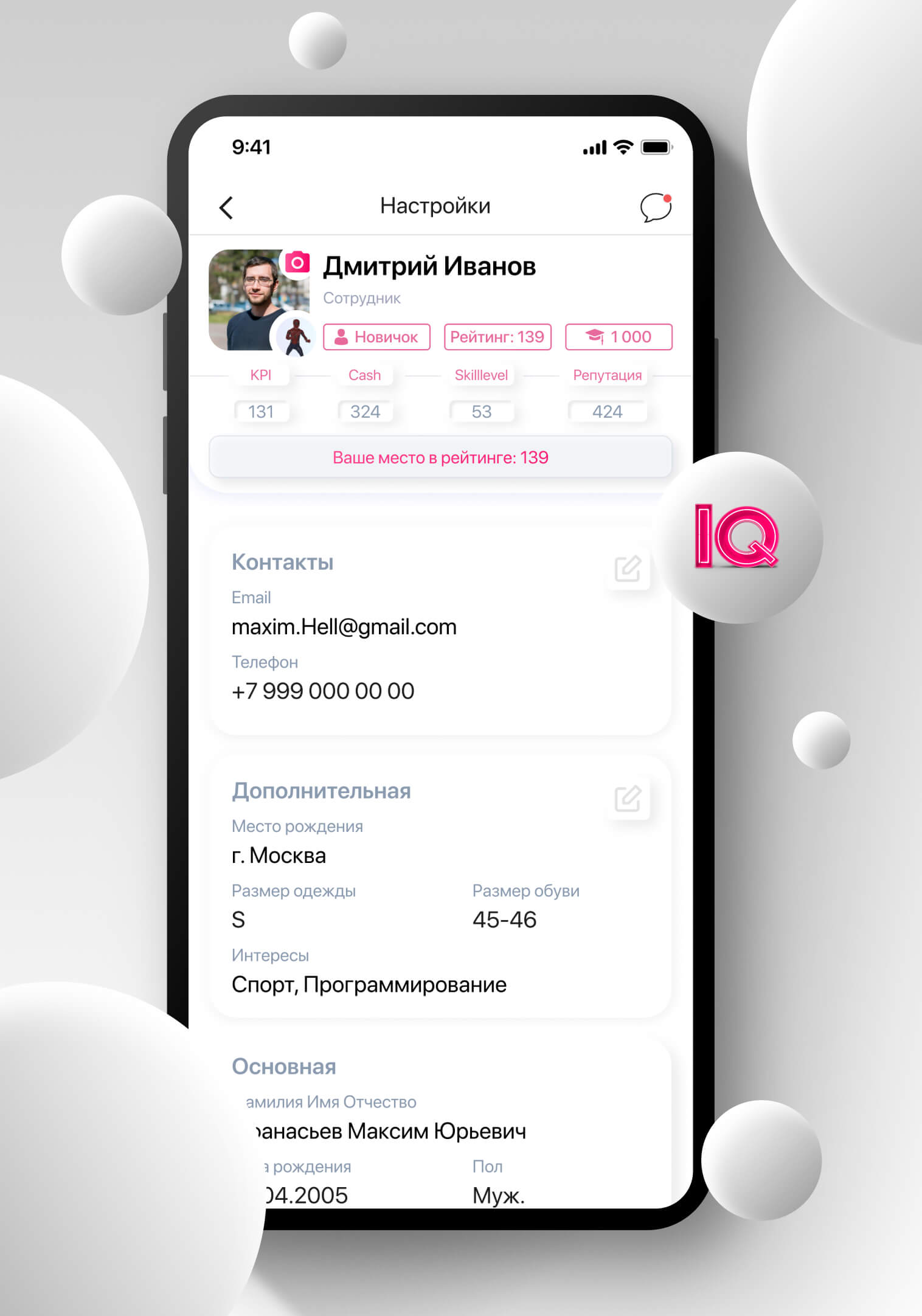 • Basic information: last name, first name, patronymic, date of birth, gender, mail, position, department, manager