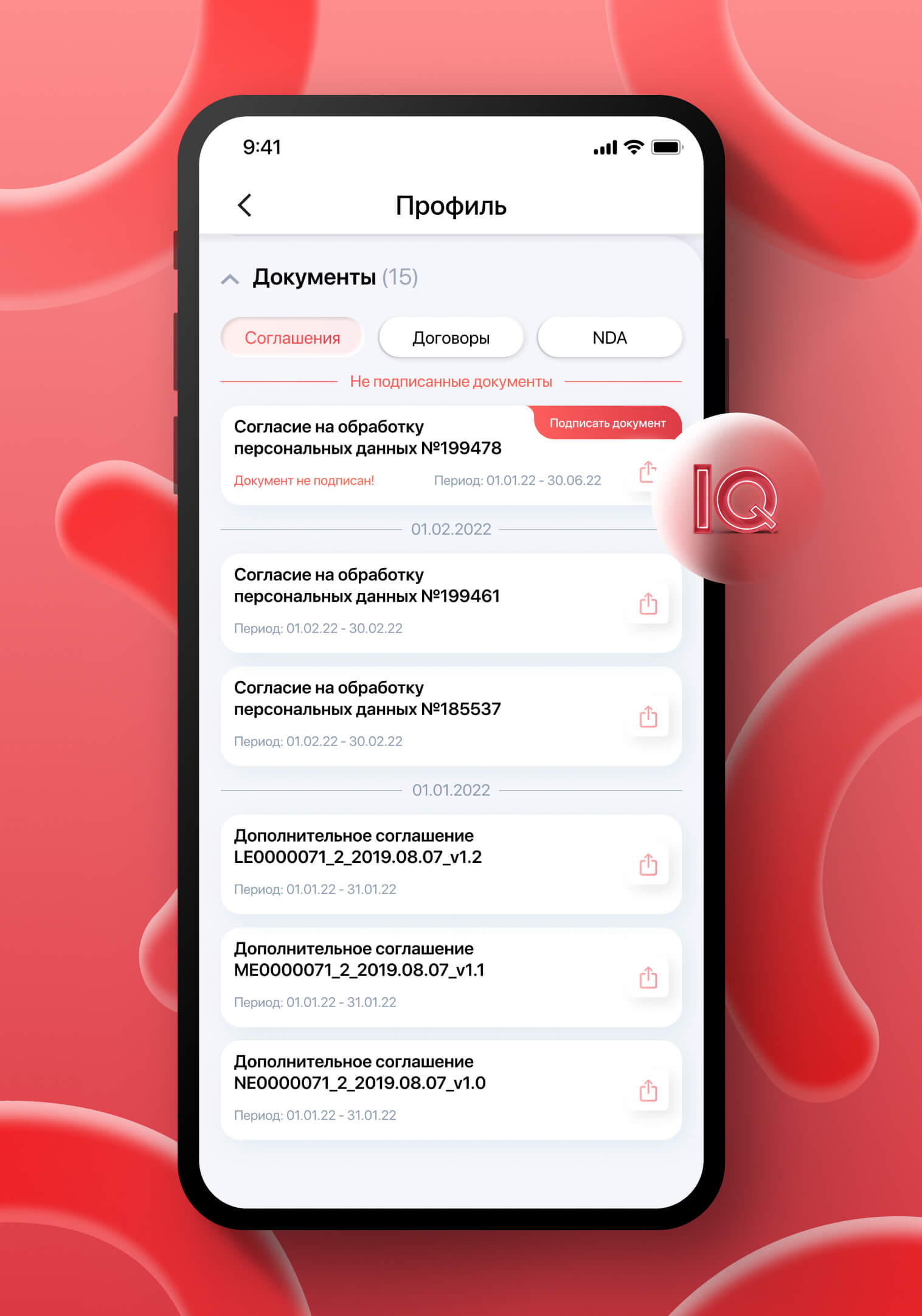 The IQ HR platform allows candidates to attach documents to fill out primary documents for employment (consent to the processing of personal data, NDA, etc.). The signing of primary documentation is carried out by means of a simple electronic signature (via SMS). All collected documents are stored encrypted in the cloud and synchronized with 1C.
