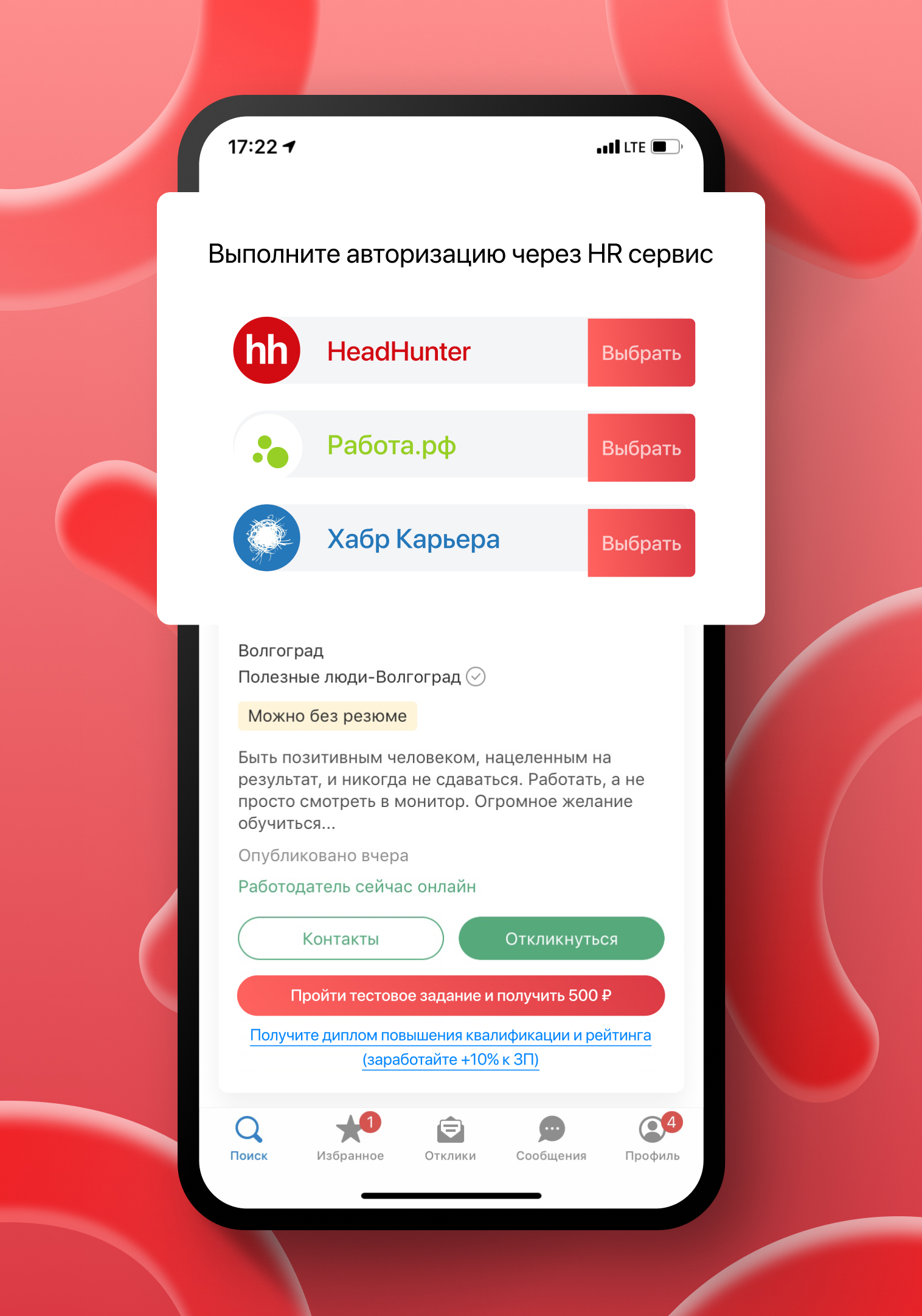 Automatic distribution of created vacancies to connected recruiting services (HH.RU, superjob.ru, avito.ru, worki.ru, HabrKarera) and thematic publics, sending out invitations to relevant candidates from the applicant database - incoming and outgoing applications.