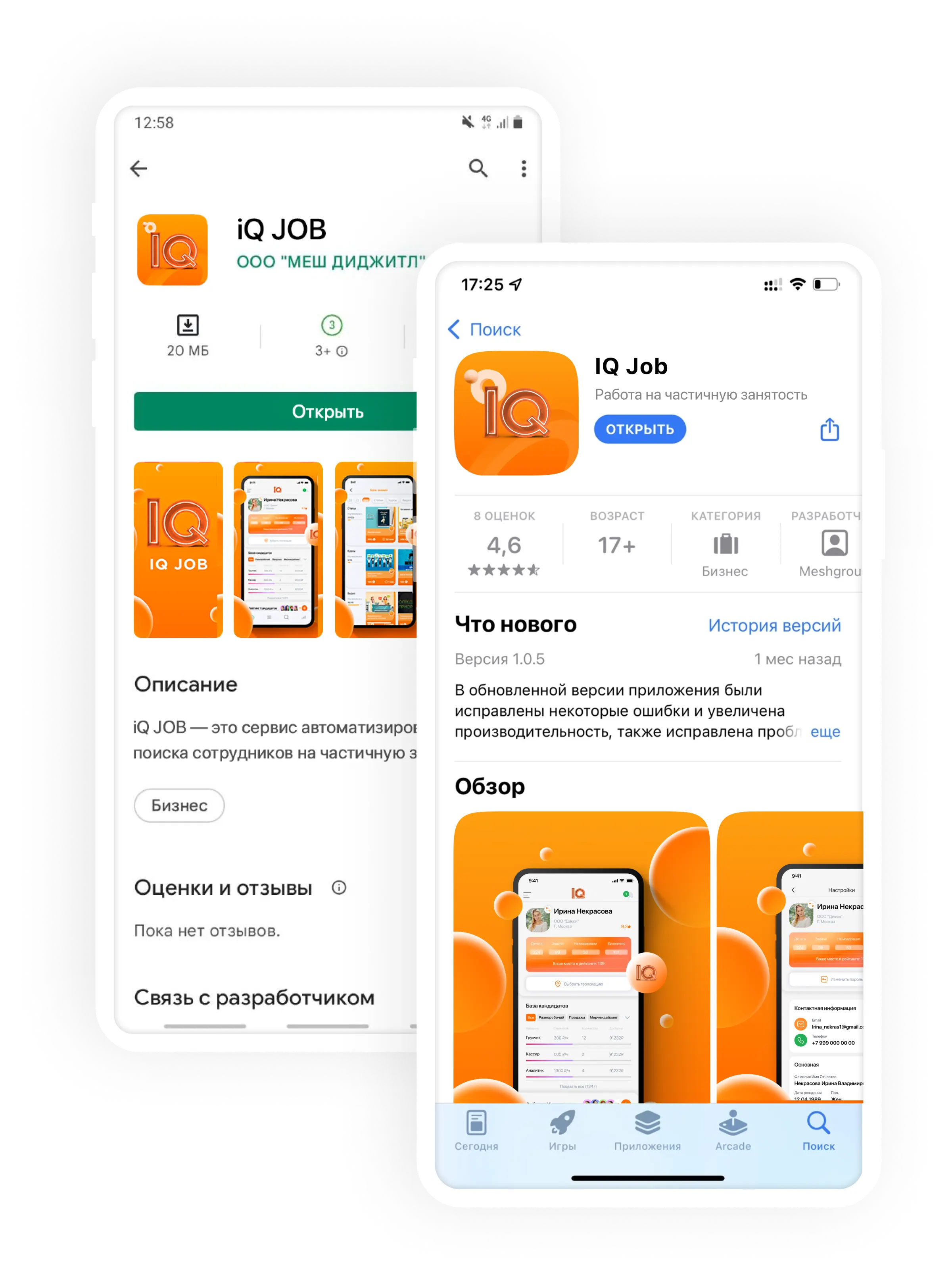 Коробочное решение IQ JOB устанавливается руководителю и ответственным за кадры сотрудникам на всех необходимых платформах — web, адаптив, мобильное приложение (IOS / Android). Платформа легко интегрируется с существующими CRM-системами (SAAS, ERP) либо с собственной CRM компании. Также приложение может работать автономно.