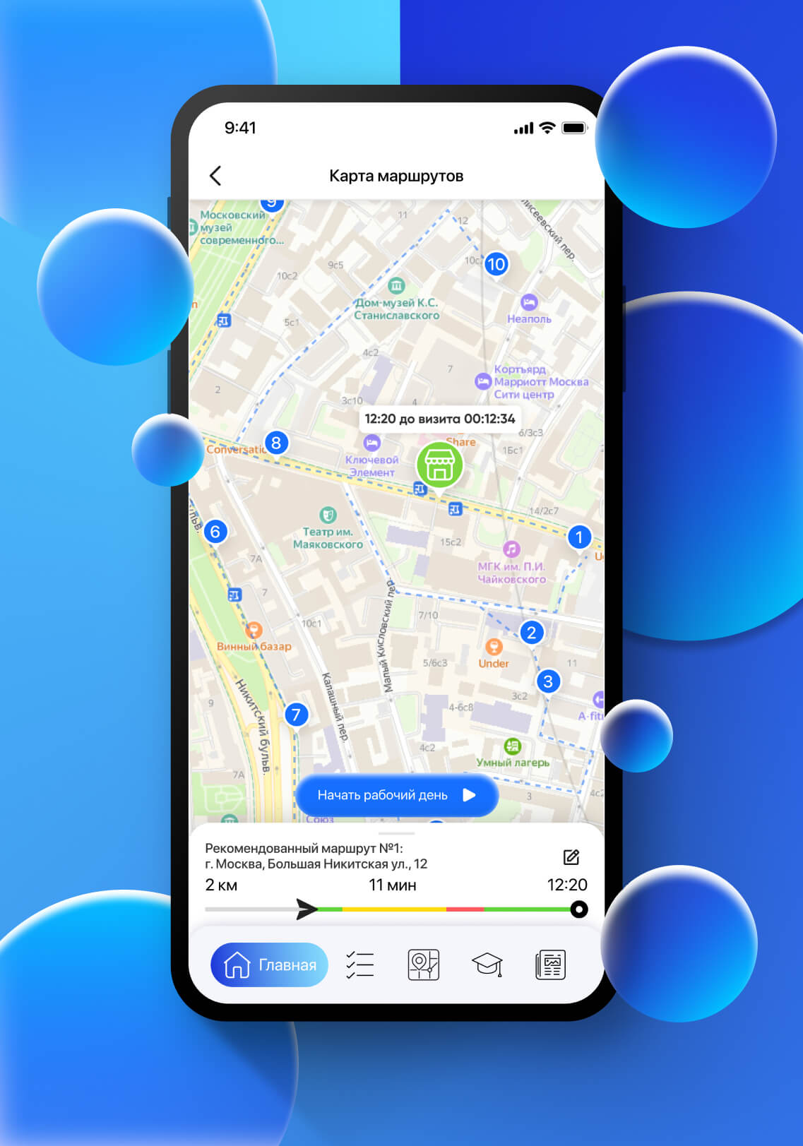 Нами был реализован революционный подход к организации планов визитов выездных сотрудников и выполнению задач в торговых точках. Интеллектуальный дашборд динамически изменяется в режиме реального времени, используя все мощности Big Data, и выстраивает оптимальные маршруты для торговых агентов, автоматически корректируя и заменяя доступные тайм-слоты при изменении приоритетности посещения того или иного магазина. Построенный маршрут отображается на интерактивной карте как для самого сотрудника, так и для его супервайзера, контролирующего местонахождение и перемещения всех торговых агентов.