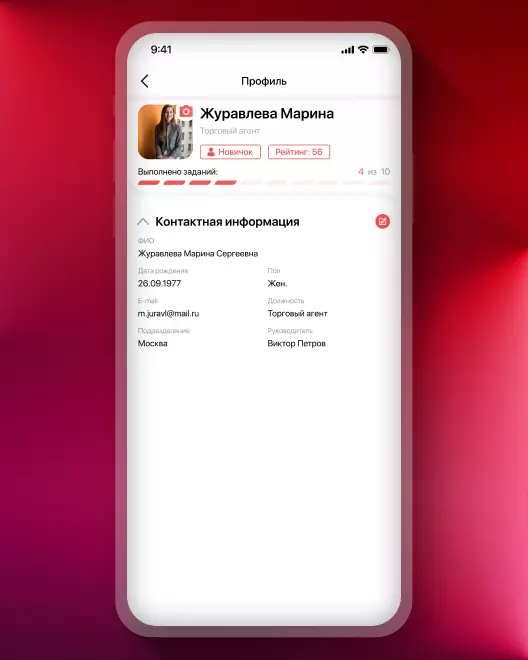 • Basic information: last name, first name, patronymic, date of birth, gender, mail, position, department, manager